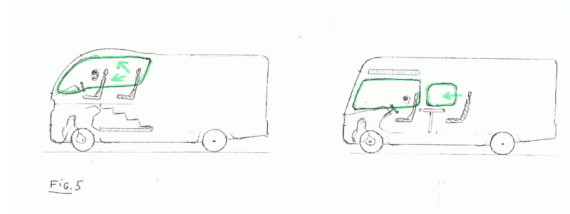On the left we can see the cab under motorhome. Stairs lead up to the driving position where there are four seats and the movable stairs link the driving position to the living quarters. New concept including sleeping bed for two in dhe cabin (also open cabin).